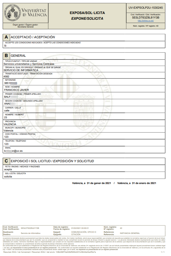The electronic registry of the Universitat de València is a service whose goal is to make its use available to citizens and the UV’s own bodies for the submission of requests, documents and electronically-processed communications. The electronic registry works as an auxiliary registry for the UV’s general entry and exit one. The registry remains operative all day and all year in the online office, without hindering the necessary interruptions for technical reasons that are notified via the same online office. Likewise, it will be possible for users to see messages communicating circumstances of unplanned interruption of the electronic registry unit’s operation whenever possible.