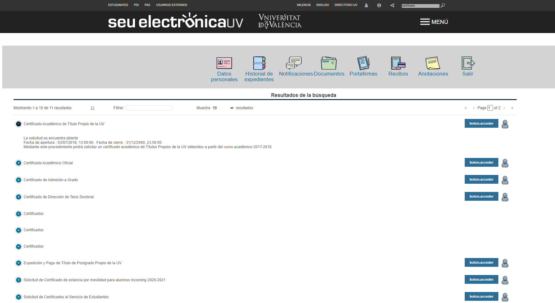 By accessing “My procedures”, the user will be able to check carried-out procedures, UV notifications - communications - notes and resolutions, access the documentation submitted by the user throughout the management procedures, as well as electronically sign documentation sent by the UV in said management procedures.
