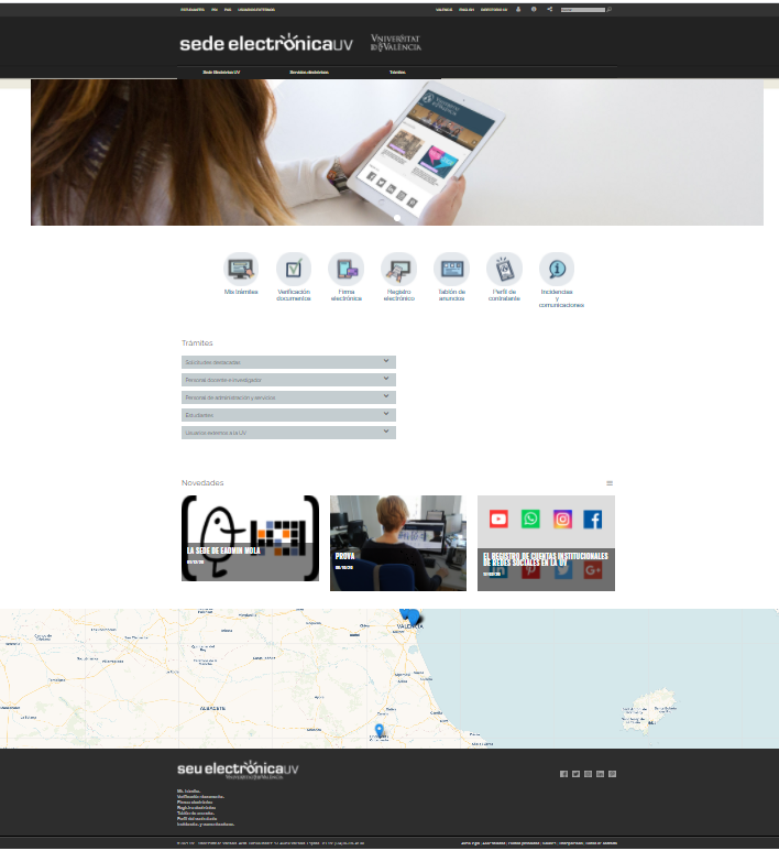 The home page of the Online Office is located within the web portal of the Universitat de València. It’s identically structured and maintains the same corporate style of the UV.