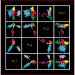 | This figure shows a scatterplot matrix of the first four principal components of the analysis of the symptoms of psoriasis. Selecting and changing the color of the points, as discussed in the examples chapter, it is possible to discriminate between the six clusters. Look at the PC1 v. PC4 to see the six clusters without much overlapping. | |
