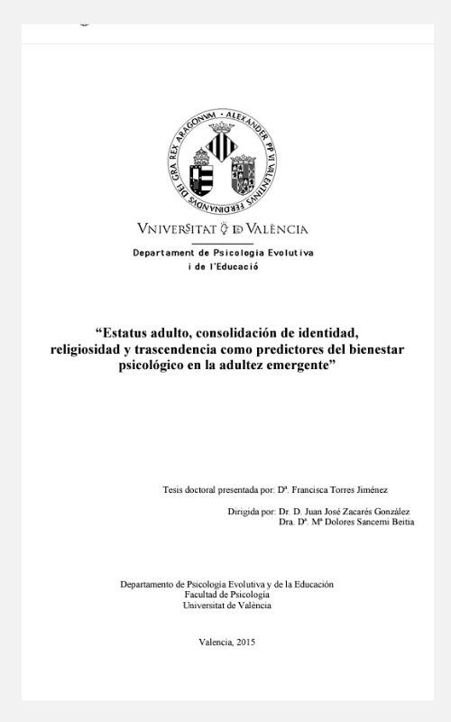 The used methodology has been quantitative, using surveys of not probabilistic sample with " ball of snow " procedure. 546 subjects between 18 and 30 years old took part in this investigation, and there were studied the variables of adult status, consolidation of identity, maturity, religiousness and transcendency, developmental optimization, ideal development and well-being. The analysis of collected information was done by different tests of quantitative methodology, which fully fit to the exploratory character of the study