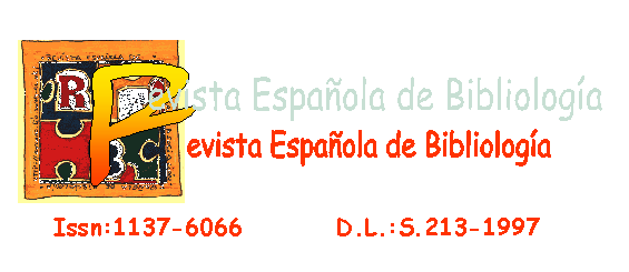 Inicio | Objetivos | Números Actual , Anteriores y Próximo | Instrucciones a los Autores | Comité Editorial ]Revista Española de Bibliología