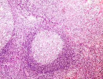 Visión específica:el tejido linfoide difuso, que se encuentra en íntima relación con el epitelio y rodeando los nódulos linfoides, está constituido fundamentalmente por linfocitos de pequeño tamaño y plasmocitos. Los linfocitos están en intima relación con las células epiteliales de las criptas llegando a verse infiltradas por ellos en sus zonas más profundas. Los nódulos linfoides secundarios presentan una cubierta celular densa oscura constituida por los linfocitos de pequeño tamaño que configuran el manto o casquete y un centro claro con población celular heterogénea destacando celulas grandes centroblásticas junto con células de menor tamaño de núcleo hendido de tipo centrocítico de la estirpe linfocitaria.