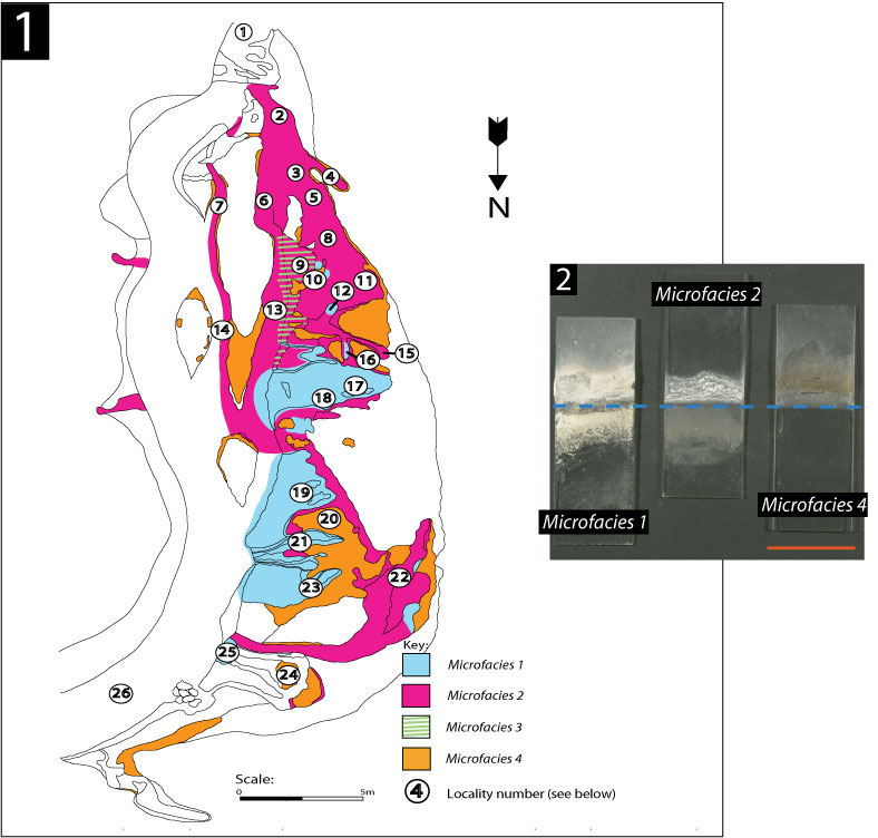 Figure 4. Characteristics of discharged thermal water from each microfacies. 4.1 Map of the study site showing approximate microfacies locations. Numbers refer to localities were measurements were taken (see Figure 4.3). (4.2) Representative examples of glass slides with subaerially accreted silica after 67 days. Differences between slides indicate different rates of subaerial silica accretion. Dashed blue line marks average water level. Note the relatively large subaqueous sulphur accumulation in Microfacies 1. A yellow-light brown substance (sulphur? and/or organics?) accumulated subaqueously in Microfacies 2. Bar represents ~3 cm. Silica accretion rates were unable to be measured for Microfacies 3. (Continued below.)