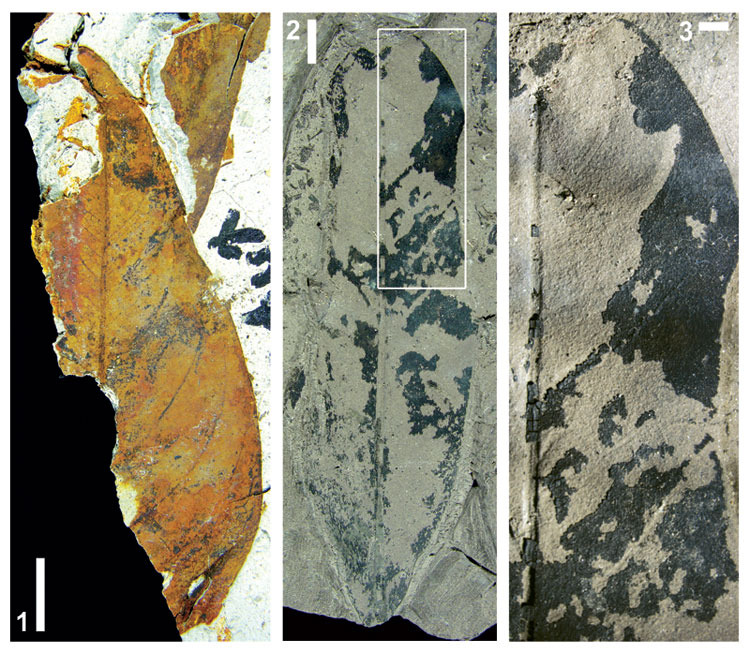 Figure 11. (1) Leaf morphotype RH08, USNM 535060. Complete specimen showing ovate blade and eucamptodromous secondary veins that turn sharply distally as they approach the margin. Scale bar equals 1 cm. (2) Leaf morphotype RH14, USNM 535063. Complete specimen showing combination of elliptic blade, high length-width ratio, entire margin, eucamptodromous secondaries, and secondary departure angle near 45†. Scale bar equals 1 cm. (3) Inset for margin detail. Scale bar equals 2 mm.
