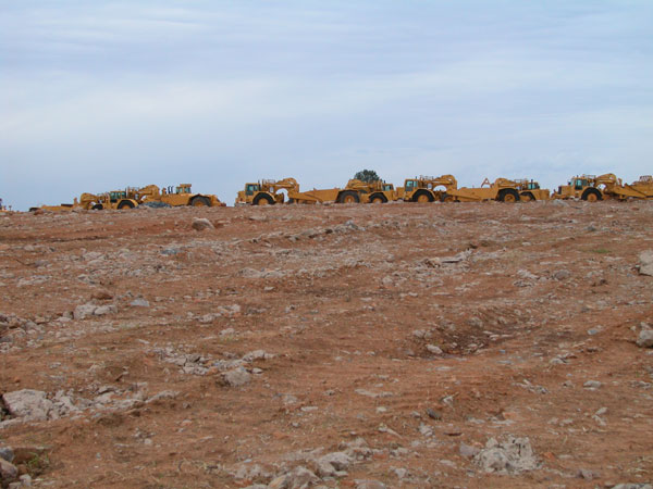 Bulldozers and loaders lined up beyond the destroyed “trilobite herds.” Image by E. Landoskii.