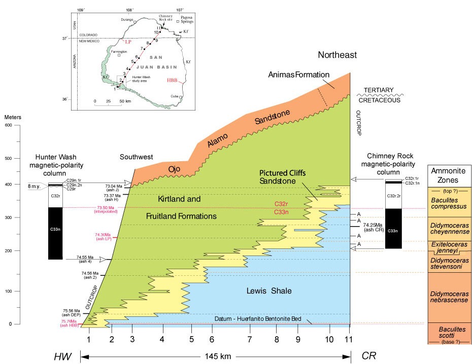 Figure 32. Stratigraphic cross section from Hunter Wash to Chimney Rock (modified from Fassett 2000). Contacts of geologic formations are from geophysical logs at localities shown (log-data are provided in Fassett and Steiner 1997). Ash-bed sample localities are shown on index map. Ash-bed ages are shown; those in red are projected into the Hunter Wash section. Letters A at right side of section show levels of ammonite collection sites. Lower ammonite-zone boundaries modified from Fassett (1985) and Fassett et al. (1997). On magnetic-polarity columns, black is normal polarity, white is reversed polarity. Vertical exaggeration = 200 X. Age of C33n-C32r magnetic-polarity reversal of 73.50 Ma is mean of 12 interpolated reversal ages based on dated ash beds bracketing reversal as discussed in Fassett and Steiner (1997) and in Fassett (2000).