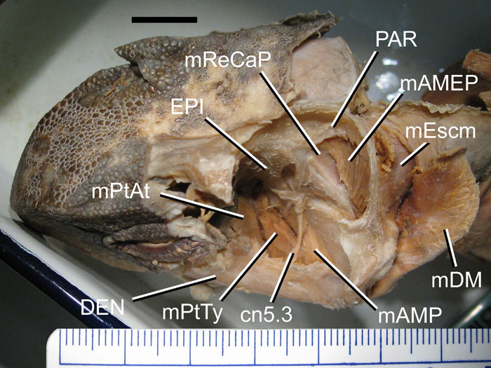 FIGURE 28. Sphenodon (BMNH 1969.2204) head in dorsolateral view with some muscles still attached. Scale equals 10 mm.