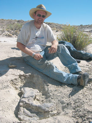 A native of the United Kingdom, Denver Fowler received a BSc degree in geology from the University of Durham (UK) in 1998, followed by an MSc in palaeobiology from the University of Bristol (UK) in 2000. He conducted graduate work at the University of Rhode Island (2001-2003) and is currently a Ph.D. candidate at Montana State University. His interests are in vertebrate paleontology and stratigraphy, primarily vertebrate biochronology through the Late Cretaceous of North America, including specifically the biostratigraphy of Alamosaurus, and ceratopsid biostratigraphy. Denver has conducted field work in the UK, USA, China and Mongolia, including extensive stratigraphic work on the K-T boundary in Montana. He worked as a vertebrate paleontology field assistant for the State Museum of Pennsylvania for four field seasons (2002-2004, 2006) where he collected fossil vertebrates from Fruitland, Kirtland and Ojo Alamo Formations. Denver is currently conducting a study of the sequence stratigraphy and biostratigraphy of the latest Maastrichtian Hell Creek and Lance Formations. Photo: Denver sitting next to a jaw of a large ceratopsid from the Naashoibto Member (Ojo Alamo Formation), San Juan Basin, New Mexico. |
