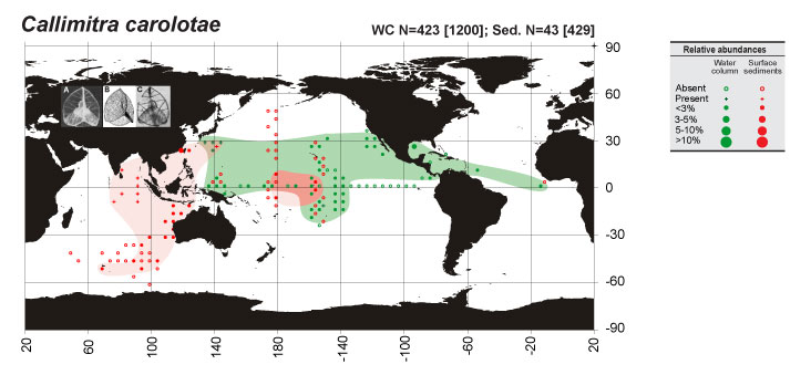 Figure 123. Geographic distribution of Callimitra carolotae. N: total number of positive records [total number of samples where the species was presumably sought], for water-column (WC) and surface sediment (Sed.) materials. Sources: A, Takahashi (1991); B, Haeckel (1887); C, Boltovskoy (1999).