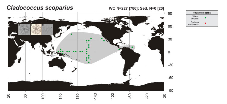 Figure 131. Geographic distribution of Cladococcus scoparius. N: total number of positive records [total number of samples where the species was presumably sought], for water-column (WC) and surface sediment (Sed.) materials. Sources: A, Takahashi (1991); B, Haeckel (1887); C, Original.
