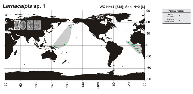 Figure 169. Geographic distribution of Larnacalpis sp. 1. N: total number of positive records [total number of samples where the species was presumably sought], for water-column (WC) and surface sediment (Sed.) materials. Sources: A, Takahashi (1991); B, Takahashi (1991); C, Original; D, Original.
