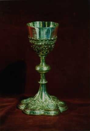 | Nº SVI: C0000200000963 D.P.Título: Caliz D.A.Título: Autor: DESCONOCIDO Objeto: Cáliz Sección: Orfebrería Técnica: Repujado. Dorado Materias: Plata sobredorada Epoca: SEGUNDO CUARTO DEL S. XX. FECHADO EN 1929 Edificio: IGLESIA PARROQUIAL DE LA SANTA CRUZ Municipio: LLOMBAI |