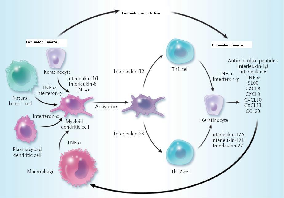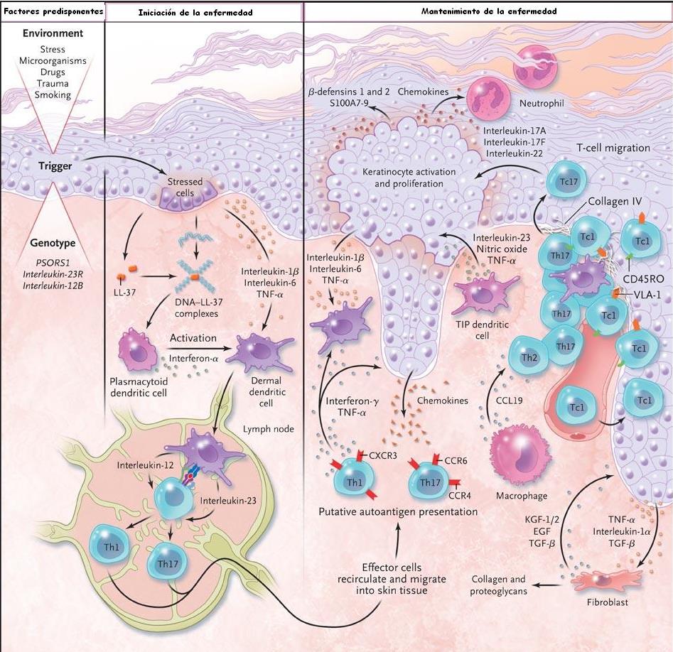 enfermedad. La interacción entre los factores medioambientales y geneticos proucen la situación de la iniciación de la enfermedad. Los factores iniciales como los traumatismos físicos o procutos bacterianos producne una cascada de situaciones que incluye la formación de complejos LL-37-DNA, la activación de las células dendríticas plamocitoies y la secreción de interferon-α. Las células dendríticas mieloides activadas migran al ganglio linfático de drenaje e inducen la diferenciación de células T indiferencidas hacia células efectoras como las células T cooperadoras tipo 17 (Th17) y tipo 1 (Th1) o células citotóxicas del tipo 1 (Tc1). Las células efectoras entran en la recirculación y se enlente en en los capilares cutáneos en presencia de las interacciones de ligangandos con las integrinas y selectinas. Las células inmunes exprsando los receptores de quimiocinas CCR6, CCR4 y CXCR3 emigran a la piel siguiendo un gradiente de citocinas. Los procesos clave en el manttemiento de la enfermedad son la presenctación de autoantigenos posibles a las células T y la liberación de interluecina-23 por parte de las células dendr´ticas dérmicas, la producción de mediadores proinflamatorias como en factor de necrosis tumoral α (TNF-α) y oxido nitrico por TNF-α y células dendríticas inducibles de la producción de oxido nítrico, y la producción de interleucina-17A, interleucina-17Fy enterleucina 11 por células Th17, Tc17 y interferona-γ y TNF-α por células Th1 y Tc1. Estos mediadores actúan en los ueratinocitos, dando lugar a la ctivación, proliferación y producción de péptidos antimicrobianos (vgr: LL37 catelicidina y β-defensinas), quimiocinas (vgr CXCL1, CXCL9 a CXCL11 y CCL20) y proteíns S100 (vgr S100A7-9) por parte de los queratinocitos. Las células dendríticas y células T forman grupos perivasculares y estrturas a tipo linfoide alrededor de los basos en presencia de quimicinas como el CCL19 producida por los macrófagos. Un punto clave es la miración de células T desde la dermis a la epidermis; esta migración se controla por medio de la interacción de la α1β1 integrina(antígeno muy tardío 1 (VLA-1) en las células T y en el colágeno IV de la memebrana basal. Células T no convencionales, incluyendo célul ast natural killer, contribuyen al proceso de la enfermedad. Cirucitos de retroalimentación con la participación de quertinocitos, fibrtoblasto y células endoteliales contirbuyen a la reorganización del tejido con la activación de células endoteliales y la proliferación y depósito de la matriz extracelular. Los neutrofilos en la epidermis son atraidos por quimiocinas incluyendo la interlucina 8 (CXCL-8 y CXCL1. nejm 361;5 2009 |