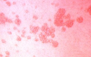 Pápulas y placas eritematosas de pequeño tamaño, bien delimitadas características de la psoriasis en gotas