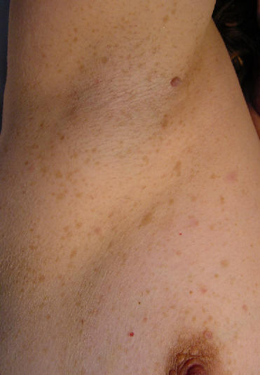 Neurofibromastosis. Múltiples neurofibfromas de pequeño tamaño y múltiples manchas cafe con leche